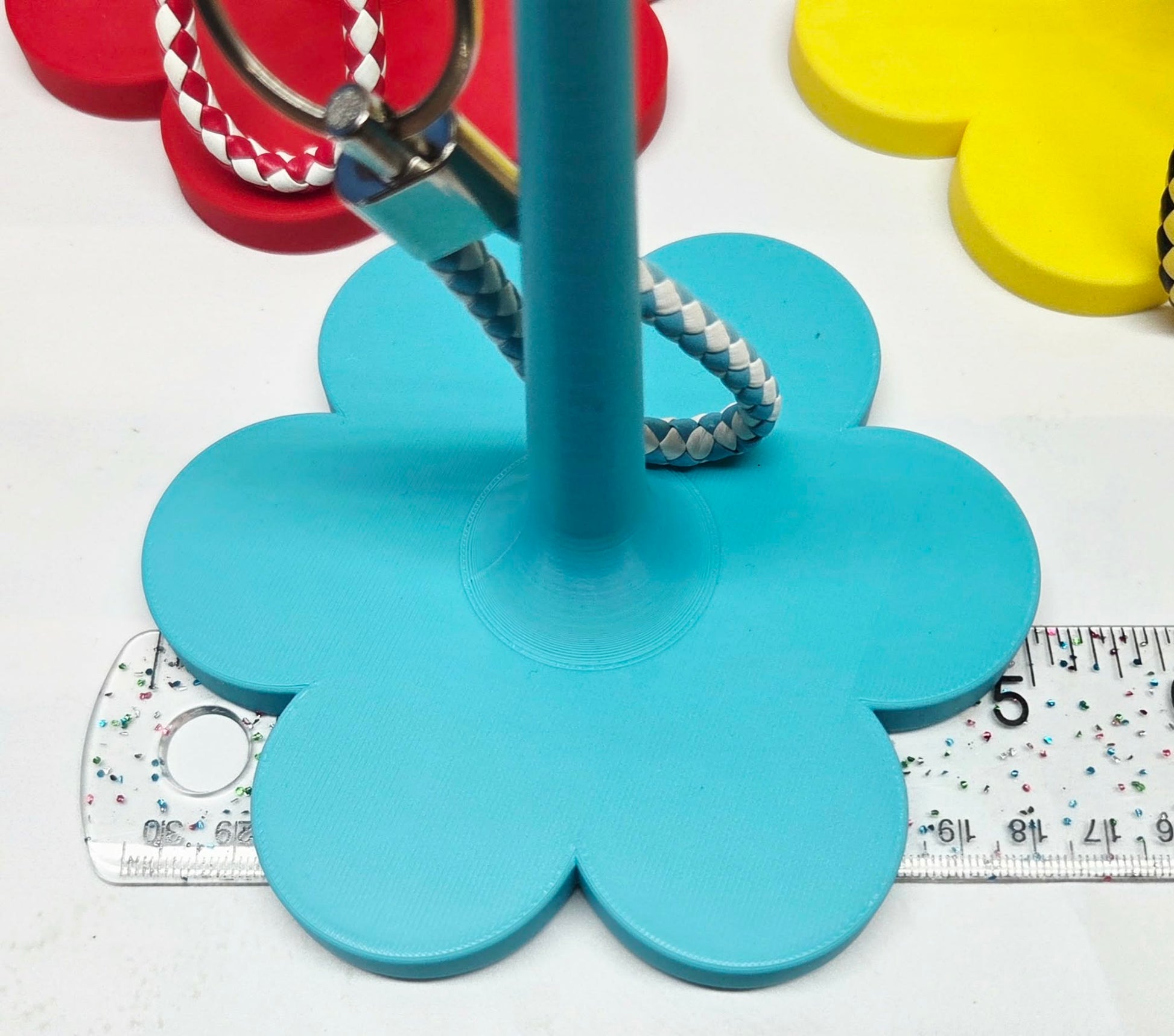 The Flower base is 5" accross at the widest point with a center post of 5.5" height which will accommodates even bulky and super bulky weight yarn cakes! A coordinating wristlet and spinner clasp makes this pretty accessory perfect for on the go creating.